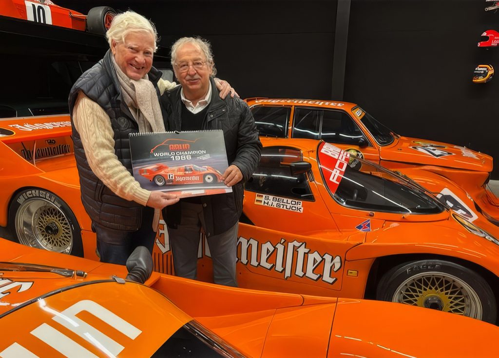 Eckhard Schimpf (Rennfahrer, Journalist, Buchautor) und Rennfahrer Kurt Ahrens mit dem Kalender